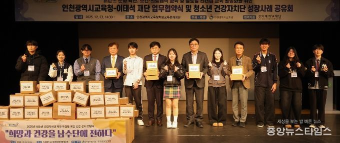 (중앙뉴스타임스 = 방재영 기자) 인천시교육청은 23일 학생교육문화회관에서 ‘2025년 청소년 건강자치단 건강 리더십 교육·성장 사례 공유회’를 열고 사단법인 이태석재단과 업무협약(MOU)을 체결했다.
