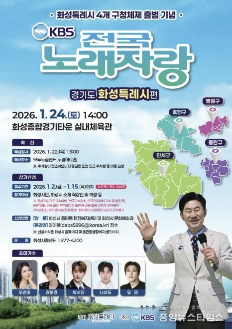 (중앙뉴스타임스 = 방재영 기자) 화성특례시는 다음 달 2일부터 15일까지 ‘KBS 전국노래자랑’ 화성특례시편 참가자를 모집한다고 24일 밝혔다.