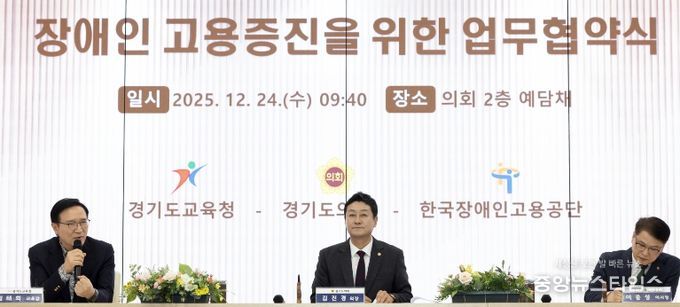 (중앙뉴스타임스 = 방재영 기자) 경기도교육청이 24일 경기도의회 예담채에서 경기도의회(의장 김진경), 한국장애인고용공단(이사장 이종성)과 함께 장애인 고용증진을 위한 업무협약을 체결했다.