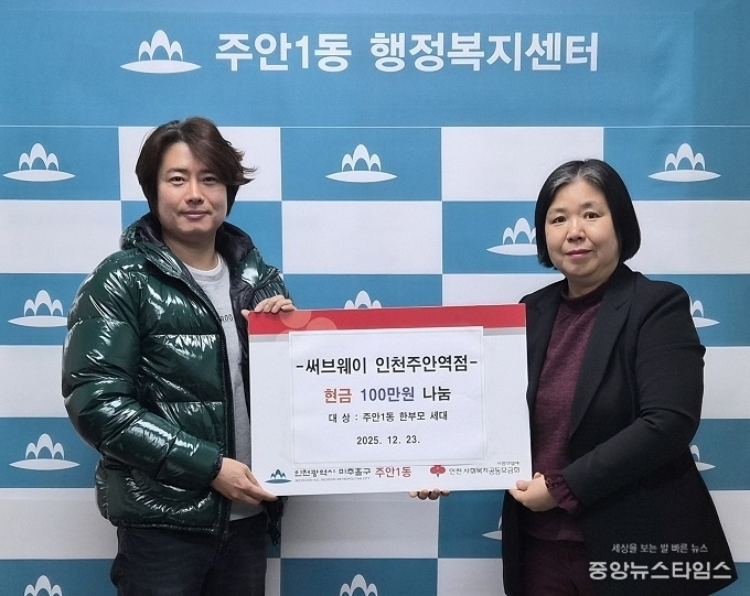 (중앙뉴스타임스 = 방재영 기자) 인천 미추홀구 주안1동(동장 하금희)은 지난 23일 써브웨이 인천주안역점(대표 김상혁)으로부터 관내 한부모가족을 위한 후원금 100만 원을 전달받았다.