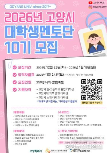 (중앙뉴스타임스 = 방재영 기자) 고양특례시가 지역 청소년들의 진로 설계를 도울 대학생 멘토단 ‘고양유니브’의 2026년도 신입 단원을 1월 18일까지 모집한다고 밝혔다.