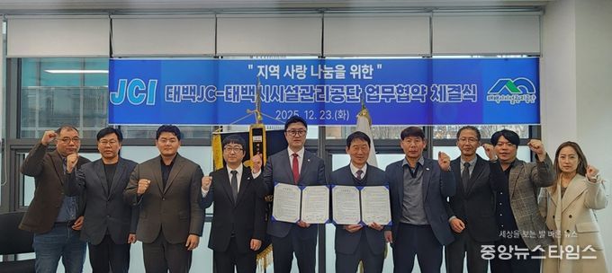 (중앙뉴스타임스 = 방재영 기자) 태백시시설관리공단과 태백JC는 지난 23일 태백시시설관리공단에서 ‘지역 사랑 나눔을 위한 업무협약(MOU)’을 체결했다.