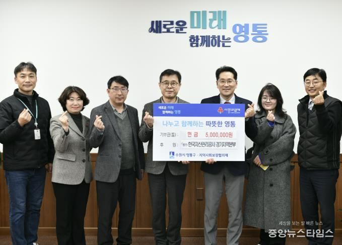 (중앙뉴스타임스 = 방재영 기자) 수원시 영통구는 지난 24일 한국자산관리공사 경기지역본부에서 관내 경제적으로 어려움을 겪는 이웃을 위해 성금 500만 원을 기부했다고 밝혔다.