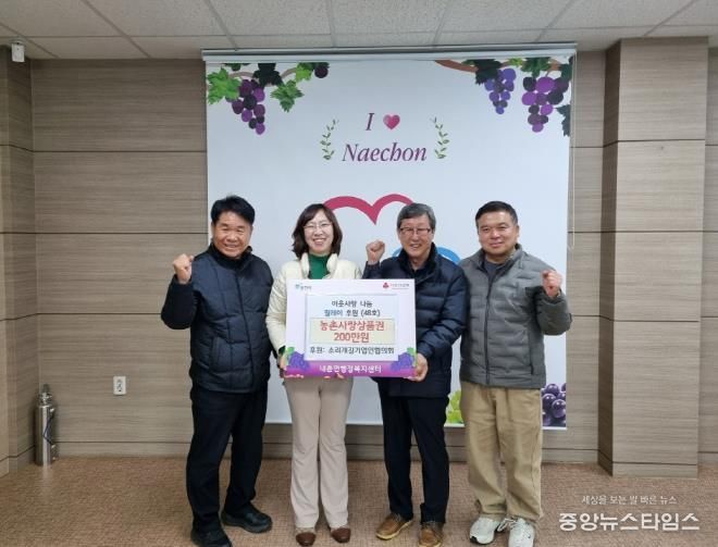 (중앙뉴스타임스 = 방재영 기자) 포천시 내촌면 행정복지센터는 지난 24일 소리개길기업인협의회가 농촌사랑상품권 200만 원 상당을 경기 사회복지공동모금회에 기탁하며 ‘이웃사랑 나눔 릴레이 48호’에 동참했다고 밝혔다.