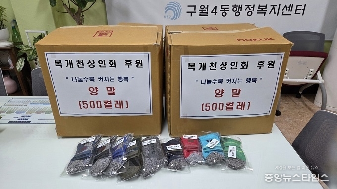 (중앙뉴스타임스 = 방재영 기자) 인천 남동구 구월4동 행정복지센터는 복개천상인회(회장 전인흥)로부터 크리스마스 양말 500켤레를 후원받았다고 26일 전했다.