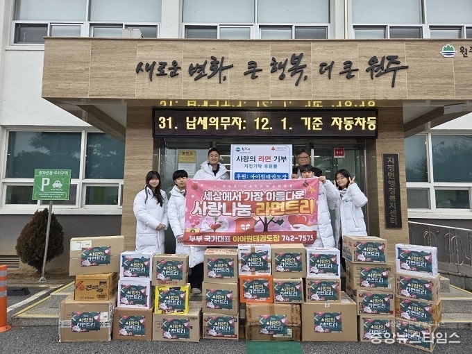 (중앙뉴스타임스 = 방재영 기자) 아이원태권도장(관장 염규문·황일란)은 지난 24일 원주시 지정면 행정복지센터에 원생들이 십시일반 마음을 모아 준비한 라면을 전달하며 연말연시 훈훈한 감동을 전했다.