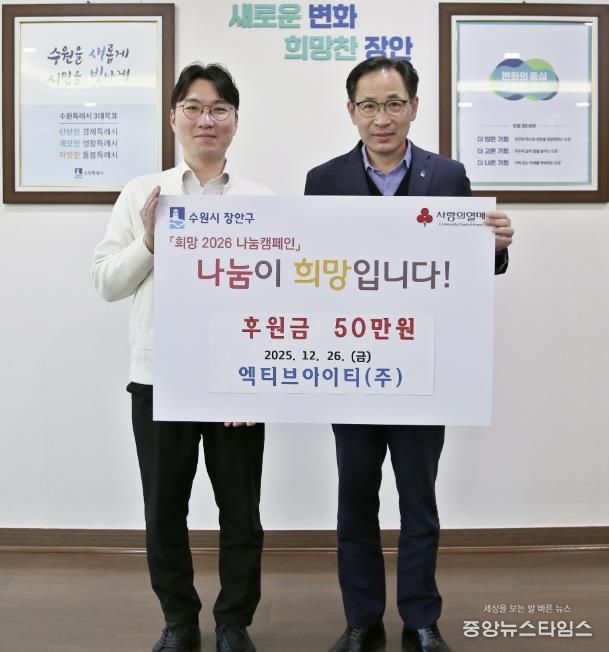 (중앙뉴스타임스 = 방재영 기자) 수원시 장안구는 지난 26일 송죽동 소재 엑티브아이티(주)가 기부금 50만 원을 전달했다고 밝혔다. 이번 기부는 장안구 관내 어려운 이웃을 돕기 위한 것으로, 지역사회에 온정을 나누는 뜻깊은 자리다.