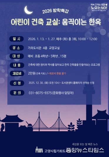 (중앙뉴스타임스 = 이광운 기자) 고양특례시 가좌도서관은 2026년 1월 13일부터 27일까지 매주 화요일 3회차에 걸쳐 방학특강 프로그램 ‘어린이 건축 교실: 움직이는 한옥’을 운영한다고 밝혔다.