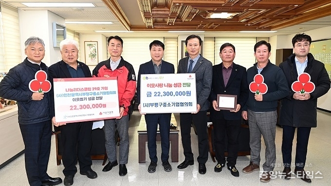 (중앙뉴스타임스 = 방재영 기자) 인천 부평구는 29일 경제단체인 사단법인 부평구중소기업협의회로부터 연말 이웃사랑 나눔 성금 2천230만원을 전달받았다.