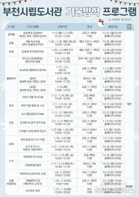 (중앙뉴스타임스 = 방재영 기자) 부천시는 겨울방학을 맞아 내년 1월부터 2월까지 부천시립도서관에서 전 연령을 대상으로 독서문화 프로그램과 행사를 운영한다고 30일 밝혔다. 이번 프로그램은 연령과 관심사에 따라 다양한 참여 기회를 제공하기 위해 마련됐다.