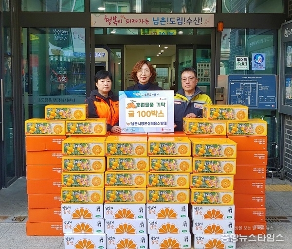 (중앙뉴스타임스 = 방재영 기자) 인천 남동구 남촌도림동은 남촌농산물도매시장 의용소방대(대장 강민성)로부터 어려운 이웃을 위한 귤 5kg 100박스를 기부받았다고 30일 밝혔다.