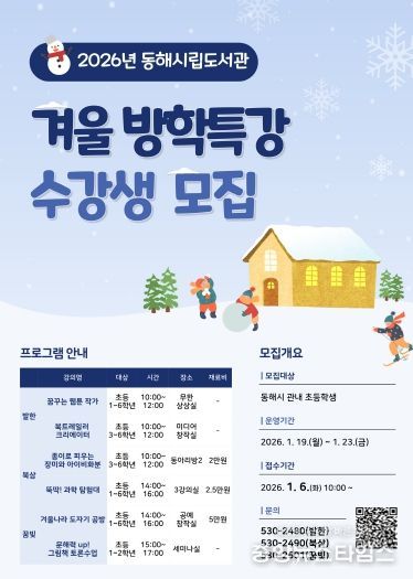 (중앙뉴스타임스 = 방재영 기자) 동해시는 2026년 겨울방학을 맞아 관내 초등학생을 대상으로 동해시립도서관에서 겨울방학 특강 프로그램을 운영한다고 밝혔다.