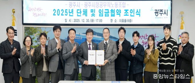 (중앙뉴스타임스 = 방재영 기자) 광주시는 지난 30일 시청 이음홀에서 광주시청 공무직노동조합과 2025년도 단체 및 임금협약을 체결했다.