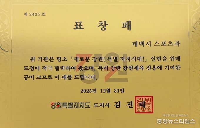 (중앙뉴스타임스 = 방재영 기자) 태백시는 태백시청 스포츠과가 지난 12월 31일, 체육 발전과 지역경제 활성화에 기여한 공로를 인정받아 강원특별도지사 기관표창을 수상했다고 밝혔다.
