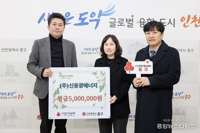 (중앙뉴스타임스 = 방재영 기자) 인천 중구는 최근 ‘신동광에너지(대표 서소영)’가 연말연시를 맞아 취약계층 복지 향상을 위한 성금 500만 원을 전달했다고 2일 밝혔다.