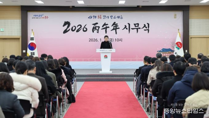 (중앙뉴스타임스 = 방재영 기자) 영종구·제물포구 출범 원년인 병오년(丙午年) 새해가 밝아온 가운데, 인천 중구가 2일 오전 중구청 월디관 대회의실에서 ‘2026년도 시무식’을 열고, 새 시대를 향한 힘찬 출발을 결의하는 자리를 만들었다.