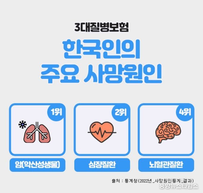 (중앙뉴스타임스 = 방재영 기자) 3대질병으로 일컬어지는 암, 뇌혈관질환, 심혈관질환은 한국인의 주요 사망원인에서 상위를 차지하고 있으며, 이에 대한 진단비를 집중적으로 보장해 주는 보험상품을 3대질병진단비 보험이라 할 수 있다.