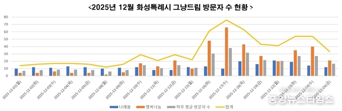 운영 초기인 ▲12월 1일부터 5일까지 하루 평균 이용자는 16명 수준이었으나, ▲12월 10일부터 12일까지는 20명대를 넘어서는 등 점차 증가세를 보였다. 이후 중반기인 ▲12월 16일부터 18일까지는 하루 평균 66명이 방문하며, 도입 초기 대비 4배 이상 증가한 수치를 기록했다. 특히, ▲12월 17일에는 하루 76명이 방문해 운영 이후 가장 많은 이용자 수를 기록했다.