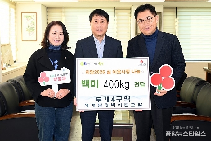 (중앙뉴스타임스 = 방재영 기자) 인천 부평구는 5일 부개4구역주택재개발정비사업조합(이하 조합)으로부터 2026년 설 이웃사랑 나눔 성품으로 백미 400kg을 전달받았다.
