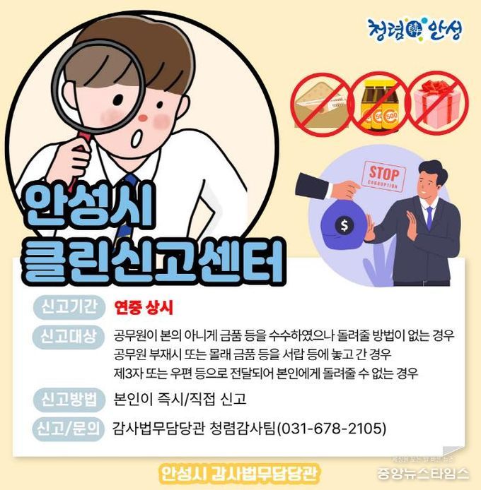(중앙뉴스타임스 = 방재영 기자) 안성시는 시민들에게 신뢰받는 공정하고 투명한 행정 서비스를 제공하기 위해 ‘클린신고센터’를 연중 상시운영하며 청렴한 행정문화 정착에 힘쓰고 있다고 7일 밝혔다.