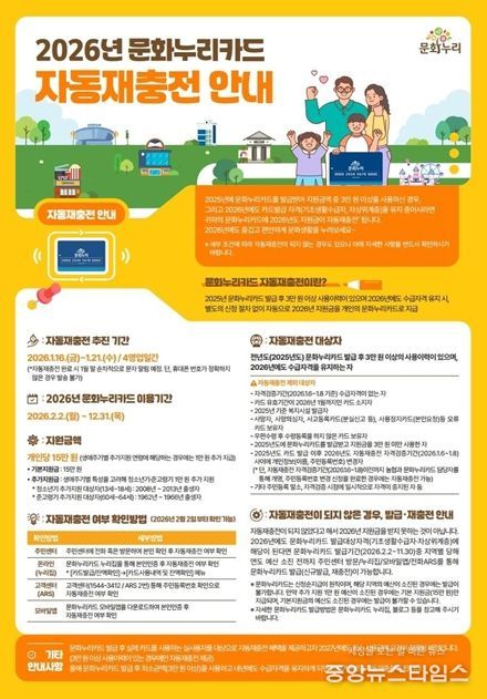 충전 완료 안내는 1월 말 문자로 발송될 예정이며 행정복지센터, 문화누리카드 누리집 고객센터 모바일 앱을 통해서도 확인할 수 있다.