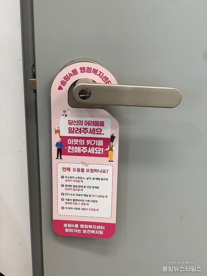 (중앙뉴스타임스 = 방재영 기자) 인천 동구 송림4동은 홍보용 ‘문고리 전단지’를 제작·배부하며 복지 사각지대 해소에 나섰다고 9일 밝혔다.