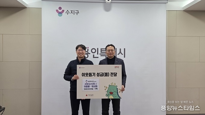 수지구는 동천동에 위치한 사출기 절전 개조 전문 업체인 ㈜서보시스(대표 이종훈)는 6일 이웃돕기 성금 300만원을 수지구에 기탁했다. ㈜서보시스는 2019년부터 매년 사랑의 열차 이어달리기에 동참하는 등 꾸준한 나눔을 실천하고 있다. 올해는 ㈜서보시스 명의로 200만 원, 이종훈 대표 본인과 자녀의 이름으로 100만 원을 기탁했다. 이 대표는 “작년에는 전기 에너지 절감에 이바지한 성과를 인정받아 자동차 부품산업 ESG, 탄소중립 박람회 등에 참가했다”며 “사업 성과를 인정받고, 그 성과를 사회에 환원할 수 있어 기쁘다”고 했다.