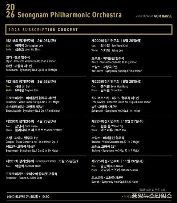 (중앙뉴스타임스 = 방재영 기자) 2026년 창단 23주년을 맞는 성남시립교향악단은 해마다 다양한 연주자와 수준높은 프로그램으로 끊임없이 매진 행렬을 이어가고 있다.