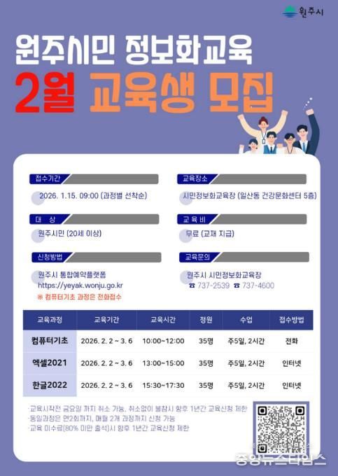 (중앙뉴스타임스 = 방재영 기자) 원주시는 시민들의 디지털 활용 능력 향상과 정보 격차 해소를 위해 시민정보화교육 2월 수강생을 모집한다.