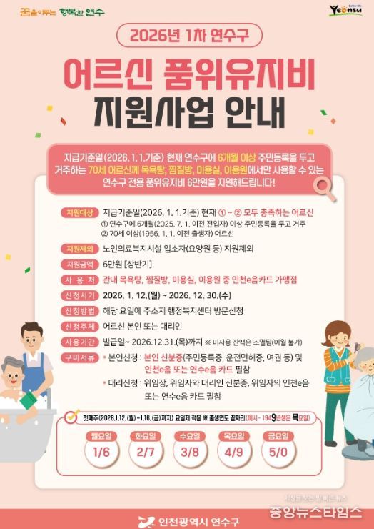 올해 1차 지원 대상은 1956년 1월 1일 이전 출생자로, 2025년 7월 1일 이전부터 연수구에 거주해 온 어르신들이다.