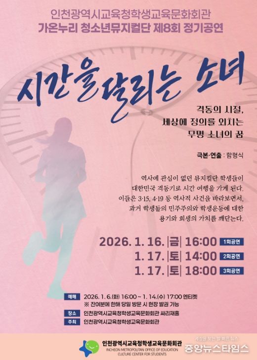 (중앙뉴스타임스 = 방재영 기자) 인천광역시교육청학생교육문화회관은 가온누리 청소년뮤지컬단 제8회 정기공연 ‘시간을 달리는 소녀’를 16일부터 17일까지 싸리재홀 대공연장에서 개최한다.