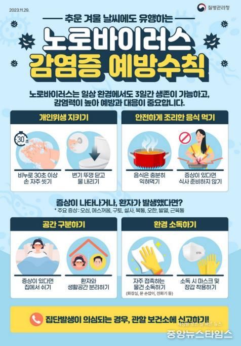 노로바이러스는 오염된 음식이나 물 섭취뿐만 아니라 사람 간 접촉, 오염된 손과 환경을 통해서도 전파되므로 개인위생 관리가 무엇보다 중요하다. 외출 후와 화장실 이용 후, 조리 및 식사 전에는 반드시 비누로 30초 이상 손을 씻어야 하며, 어패류 등 식품은 충분히 가열해 섭취하고 조리기구는 사용 후 즉시 세척·소독해야 한다.