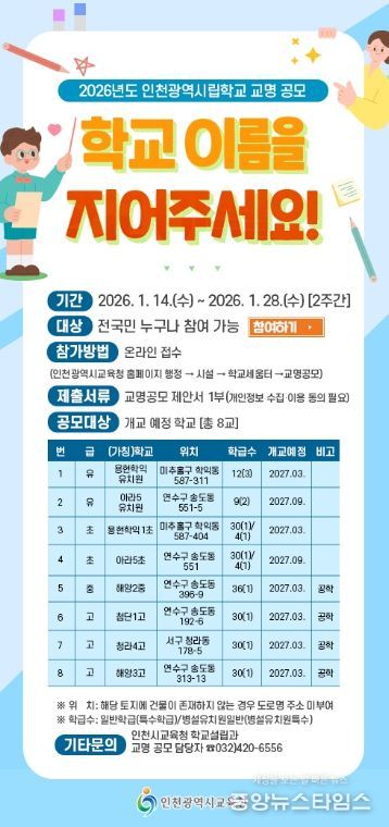 (중앙뉴스타임스 = 방재영 기자) 인천광역시교육청은 1월 14일부터 28일까지 2주간 신설학교 8교의 명칭을 공모한다.