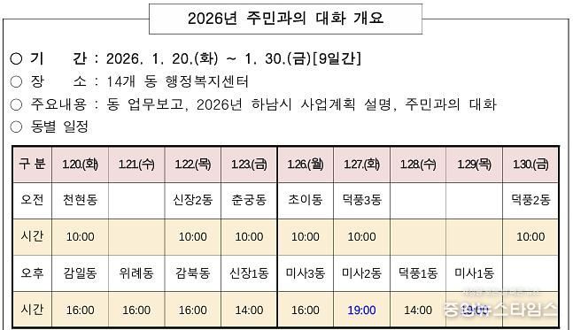 (중앙뉴스타임스 = 방재영 기자) 하남시는 오는 20일부터 30일까지 관내 각 동 행정복지센터를 순회하며 ‘2026년 주민과의 대화’를 개최한다고 13일 밝혔다.