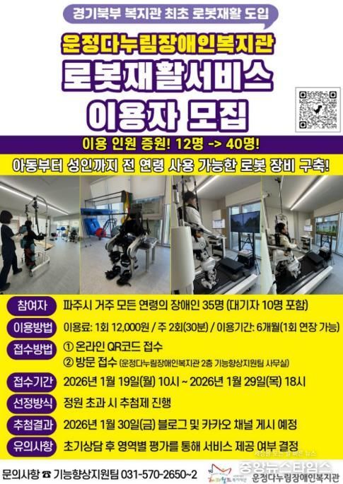 이에 따라 파주시는 2025년 12월 지면 보행형 로봇 재활 훈련 장치 1대를 추가 설치해 아동부터 성인까지 전 연령층이 이용할 수 있는 로봇 재활 기반 시설을 구축했다. 또한 올해 1월 중에는 치료사 2명을 추가로 채용해 로봇 재활치료 이용 정원을 대폭 확대할 예정이다.