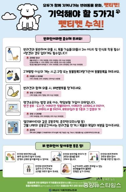 홍보물에는 ▲외출 시 목줄·가슴줄(2m 이내) 및 인식표 착용 ▲2개월령 이상 반려견의 동물등록 ▲배변 봉투 지참 ▲맹견 소유자의 법정 교육 이수 ▲엘리베이터 내 반려동물 안기 등 '기억해야 할 5가지 펫티켓'이 담겼다. 비반려인을 위해서도 타인의 반려견을 응시하거나 동의 없이 만지지 않기 등의 에티켓을 함께 안내해 주민 간 갈등 예방에 힘쓰고 있다.