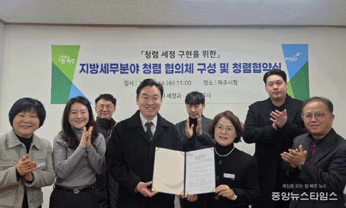 (중앙뉴스타임스 = 방재영 기자) 파주시는 지난 14일 파주지역세무사회(마을세무사)와 함께 청렴 문화의 정착과 확산을 위한 민관 청렴협의체를 구성하고, 청렴 실천을 위한 협약을 체결했다고 밝혔다.