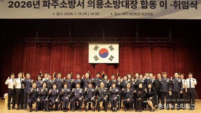 (중앙뉴스타임스 = 방재영 기자) 파주소방서는 1월 15일 파주시민회관 대공연장에서 『2026년 파주소방서 의용소방대 대장 합동 이·취임식』을 열고, 지역 안전을 위해 헌신해온 이임 대장들의 공로에 감사를 전하는 한편, 새로운 리더들과 함께 ‘의용’의 사명을 이어갈 뜻을 다졌다.