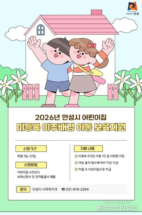 안성시 관계자는 “돌봄 공백 속에 방치될 우려가 있는 미등록 이주배경 아동들이 보육돌봄의 기회를 제공받게 됐다”며 “보육비 부담을 덜고, 모든 아동이 건강하게 성장할 수 있는 포용적 보육환경 조성에 힘쓰겠다”고 말했다.