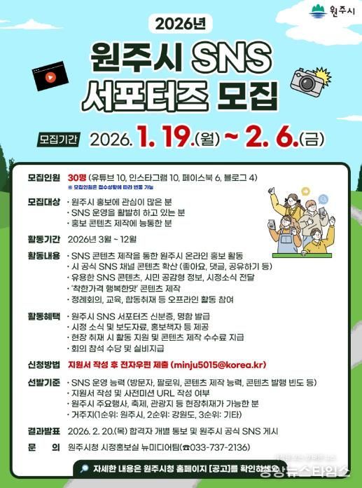 (중앙뉴스타임스 = 방재영 기자) 원주시는 참신한 아이디어와 열정을 가진 ‘2026년 원주시 SNS 서포터즈’를 다음 달 6일까지 모집한다고 19일 밝혔다.