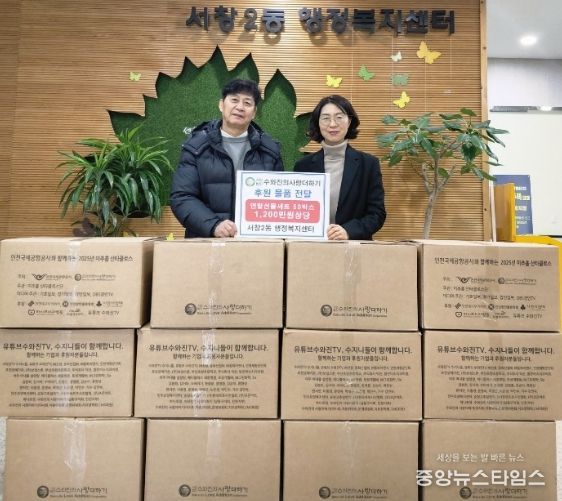 (중앙뉴스타임스 = 방재영 기자) 인천 남동구 서창2동 행정복지센터는 (사)수와진의 사랑더하기로부터 어려운 이웃을 위한 겨울 선물세트 50상자를 기부받았다고 19일 밝혔다.