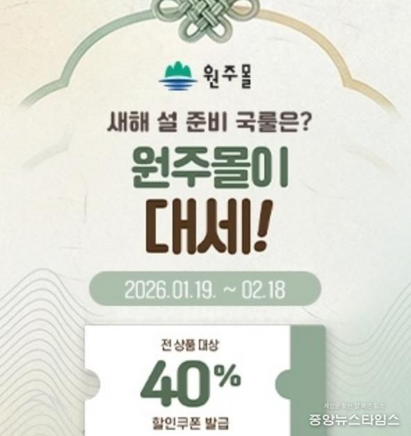 (중앙뉴스타임스 = 방재영 기자) 원주시 공식 인터넷 쇼핑몰 ‘원주몰’이 설 명절을 맞아 다음 달 18일까지 ‘2026 원주몰 설맞이 기획전’을 진행한다.