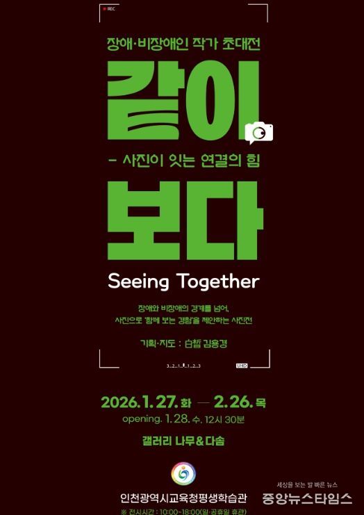 (중앙뉴스타임스 = 방재영 기자) 인천광역시교육청평생학습관은 인천 시민을 대상으로 2층 갤러리 나무와 다솜에서 ‘같이, 보다(Seeing Together) 장애인 작가 초대전’을 개최한다.