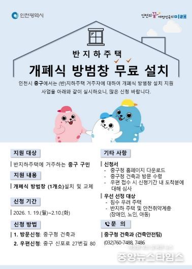 (중앙뉴스타임스 = 방재영 기자) 인천 중구는 올해에도 반지하주택을 대상으로 ‘개폐식 방범창’ 설치를 무상 지원하며, 침수 피해 예방에 나선다고 20일 밝혔다.