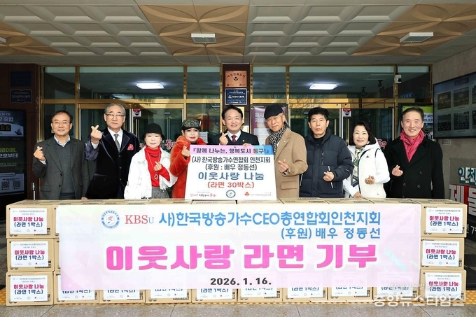 (중앙뉴스타임스 = 방재영 기자) (사)한국방송가수연합회 인천지회(회장 금진)가 지난 16일 라면 30상자(100만원 상당)를 동구에 기탁했다.