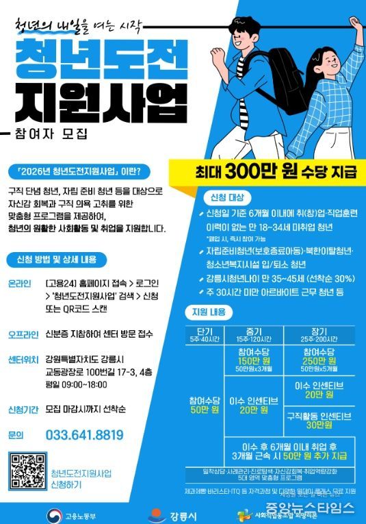 (중앙뉴스타임스 = 방재영 기자) 강릉시는 구직을 단념했거나 사회 진입에 어려움을 겪고 있는 청년들의 회복과 재도전을 지원하기 위해, ‘2026년 청년도전지원사업’ 참여자를 신규 모집하고 본격적인 사업 추진에 나선다고 21일 밝혔다.