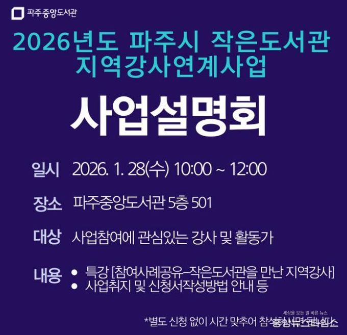 (중앙뉴스타임스 = 방재영 기자) 파주시 중앙도서관은 지역의 작가, 예술가, 독서문화 활동가 등 인재를 발굴해 작은도서관의 독서문화 프로그램을 지원하는 녪년 작은도서관 지역강사 연계사업’에 참여할 지역강사를 모집한다.