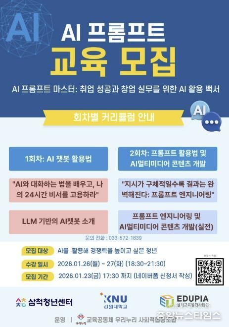 삼척청년센터 관계자는 “AI 기술을 단순한 정보 습득 도구가 아닌 청년들의 취업과 창업 경쟁력을 높이는 실질적 역량으로 연결하기 위해 이번 교육을 마련했다”며 “AI 활용에 관심 있는 시민들의 많은 참여를 기대한다”고 말했다.