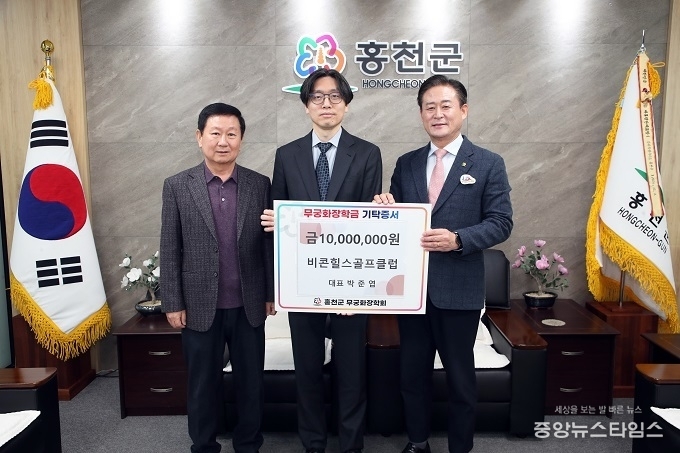 (중앙뉴스타임스 = 방재영 기자) 비콘힐스 골프클럽(대표 박준엽)이 21일 홍천군 인재 육성을 위한 무궁화장학금 1000만 원을 기탁했다.