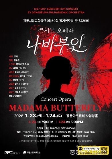 (중앙뉴스타임스 = 방재영 기자) 강릉시립교향악단은 2026년의 첫 정기연주회로 오는 23일 19시 30분, 24일 17시 강릉아트센터 사임당홀에서 콘서트 오페라‘나비부인’을 선보인다.